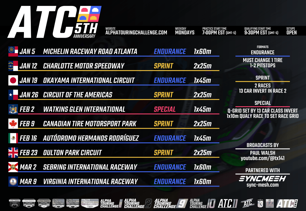This season’s special event celebrates the series 5th anniversary! Our first points race was on February 1, 2021. This event features a non-points-paying qualifying race that sets the grid for a normal 45 minute endurance race. The grid for the qualifying race itself will be set by a 13-car class invert based on current standings.